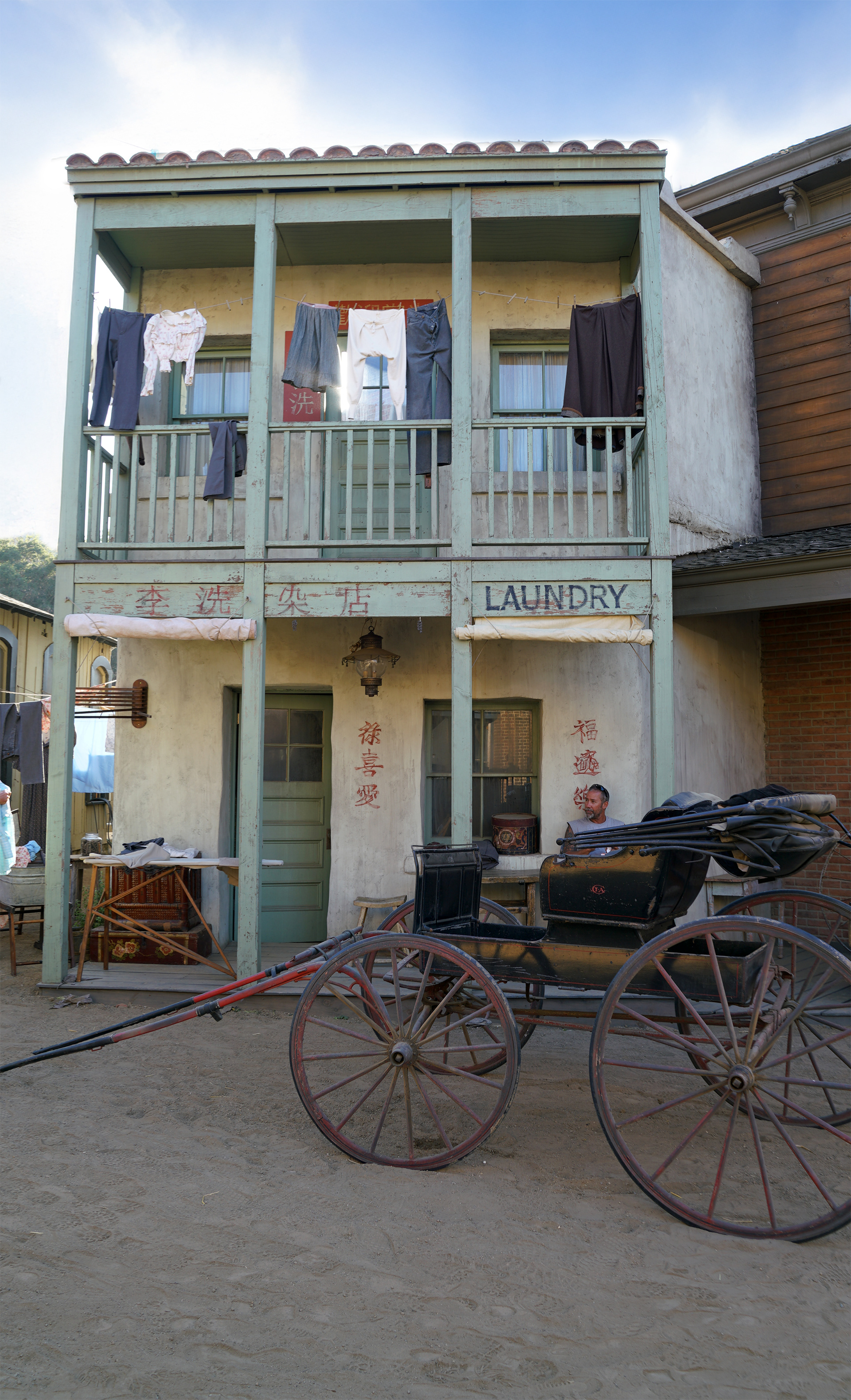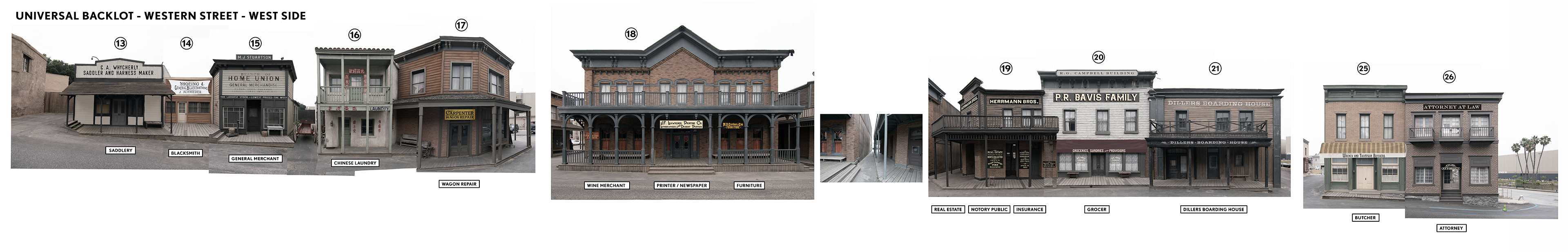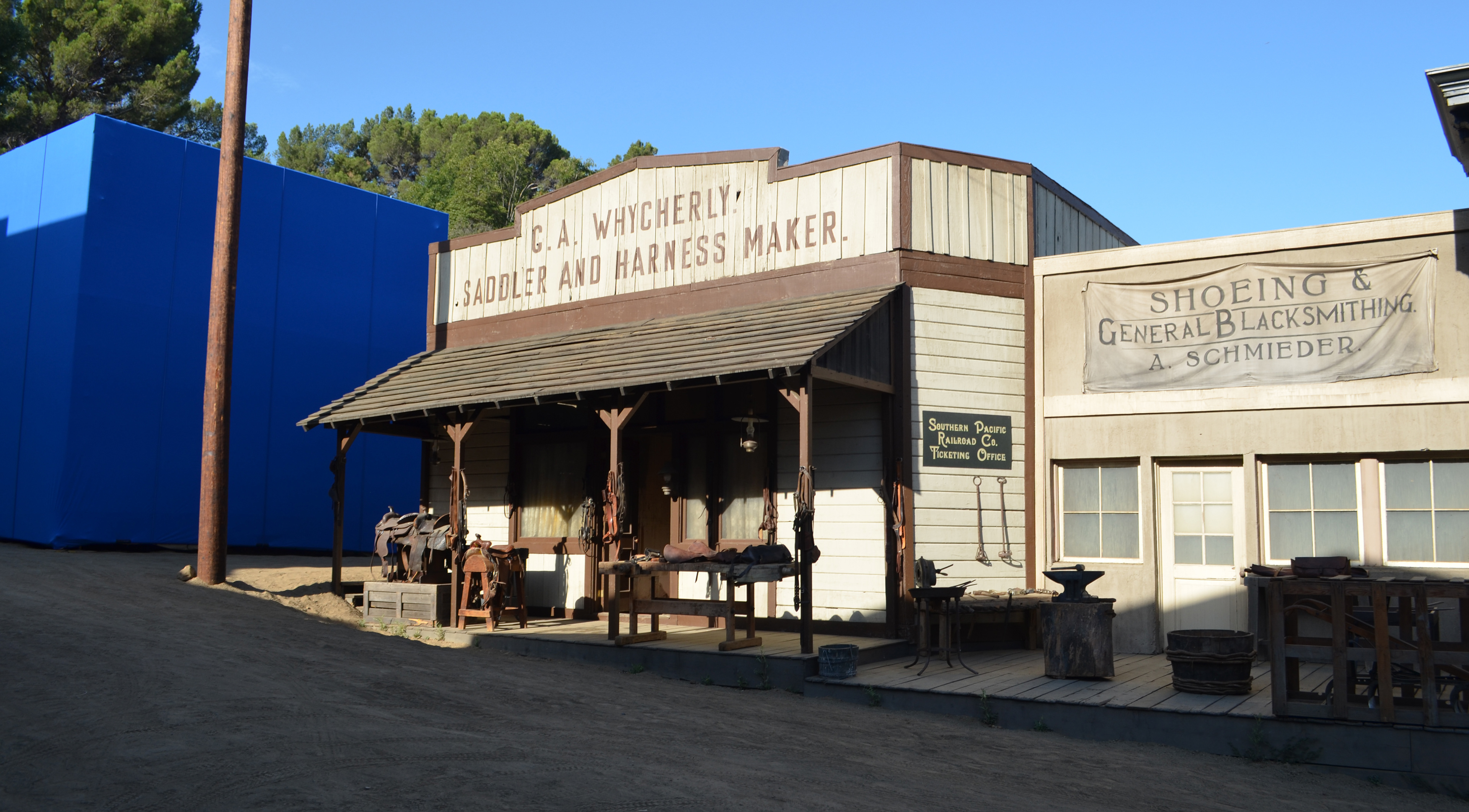The western town sequence was built on the Universal backlot—one of the few environments created entirely in-camera. I produced the on-set graphics for the storefronts and signage, working with the art director and scenic department to place each element within the existing architecture. Everything was scaled, printed, or painted specifically for how it would read through the lens, giving the town its texture and sense of history.